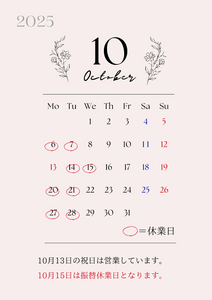 いつもマリエクチュールをご利用いただき誠にありがとうございます。2025年10月の休業日のご案内です。