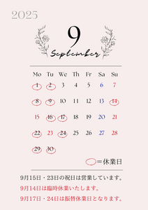 いつもマリエクチュールをご利用いただき誠にありがとうございます。2025年9月の休業日のご案内です。